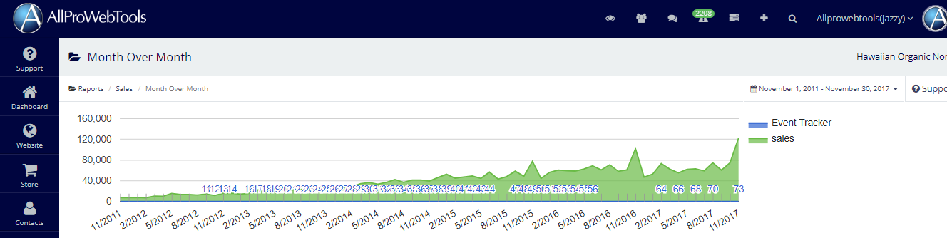 - Monthly online sales: $7,000 baseline (early 2011) to over $50,000 (by April 2015) to $103,587.50 (November 2016).